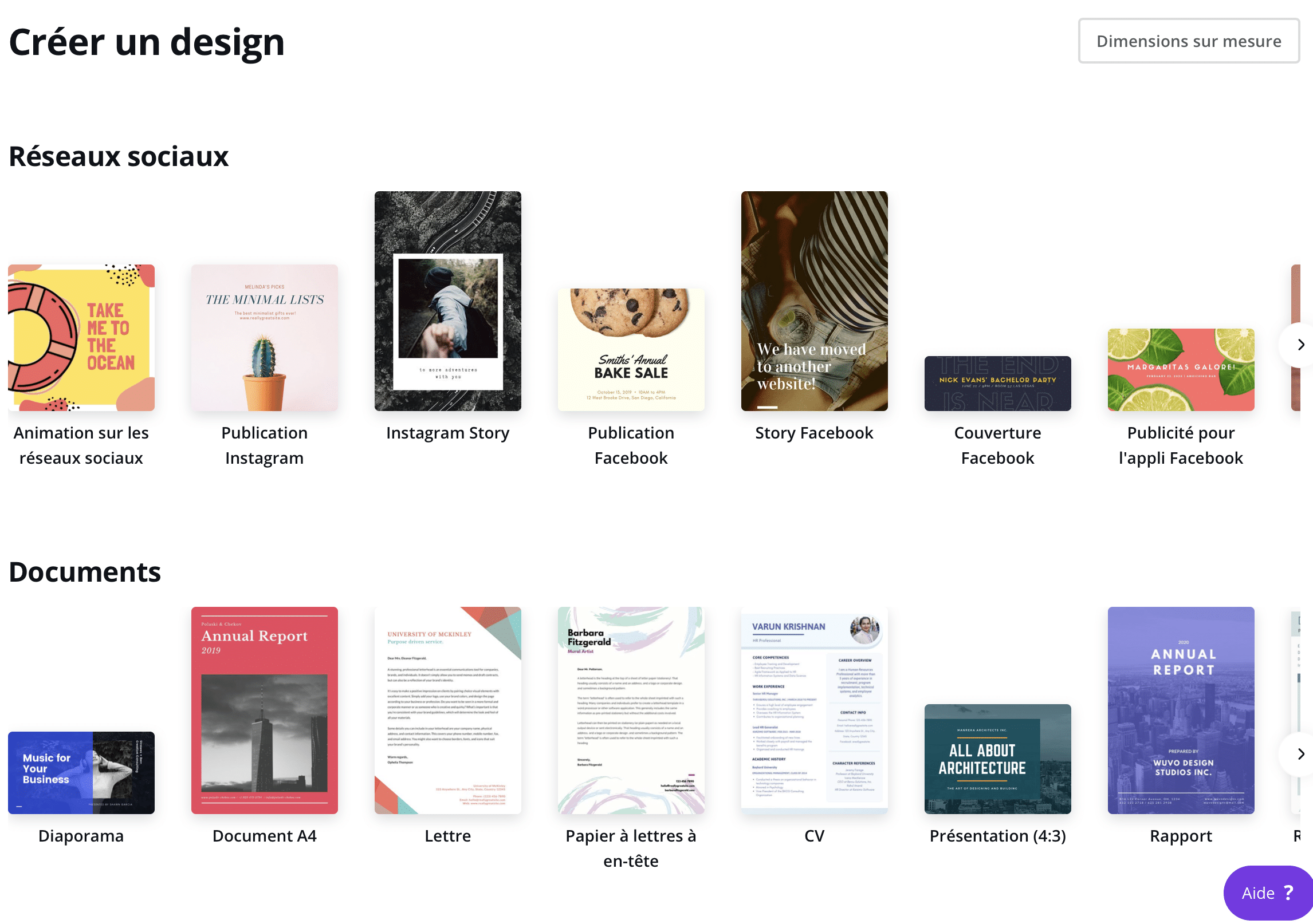 Le premier avantage de Canva est que vous pouvez choisir le type de visuel que vous souhaitez réaliser. Vous pouvez par ailleurs faire le choix d’un document (comme un CV par exemple), mais nous reviendrons sur cela lors d’un prochain article. En ce qui concerne les visuels donc, vous pouvez choisir votre format : publication Instagram, story Facebook, bannière Twitter ou encore vignette YouTube : tous les formats possibles et imaginables existants sur le web sont disponibles. C’est là la vraie force de Canva. Plus besoin de s’inquiéter pour la taille d’un visuel, le site le fait pour vous.