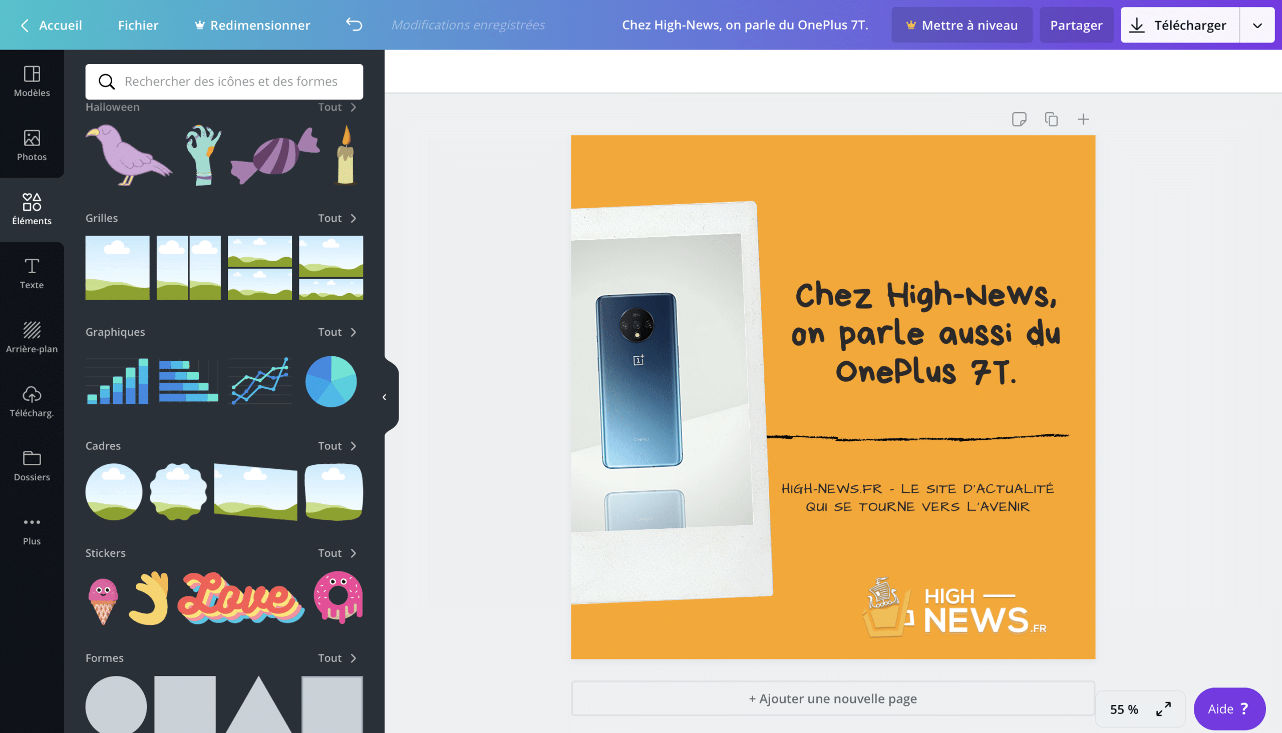 Ensuite, pour modifier la photo, il suffit de télécharger l’image de votre choix ou bien d’en choisir une dans la banque disponible sur le site dans l’onglet photo. Attention, certaines de ces images nécessitent un compte premium, ou bien d’être achetées individuellement. Ici, nous ferons le choix de prendre une image du OnePlus 7T, pour parler d’un article que nous avons présenté récemment. Ah oui, si vous faites le choix d’utiliser une image d’internet, pensez toujours à vérifier si vous avez les droits d’auteur. Petit conseil qui peut vous éviter de gros ennuis.