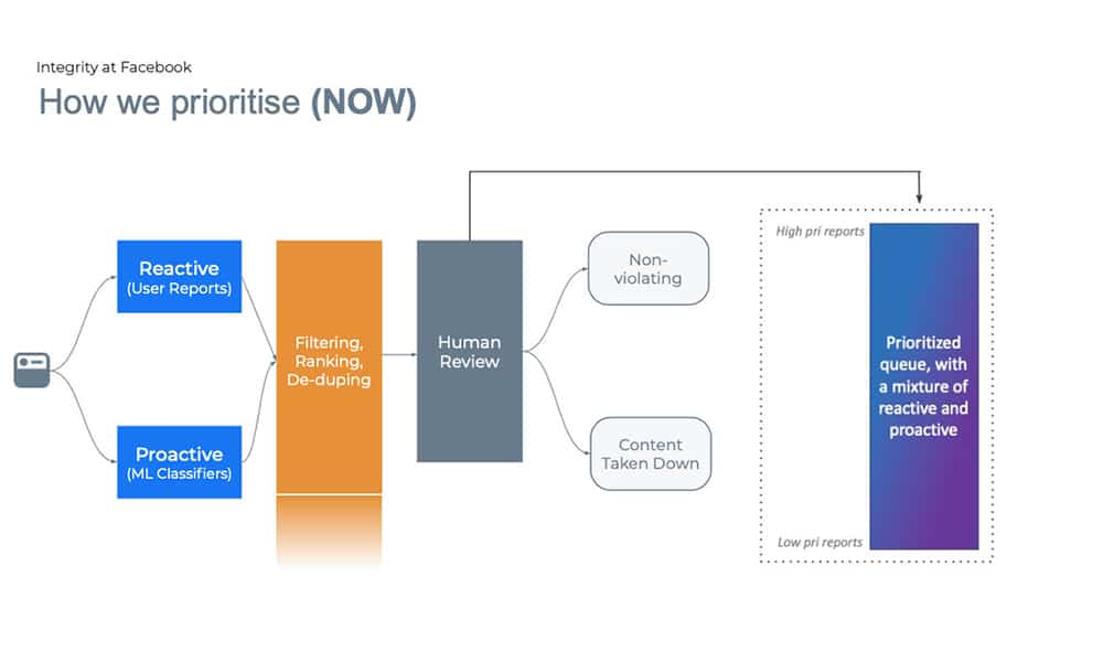 Dans cette IA, Facebook espère que les messages les plus prioritaires remontent en premiers ce qui permettra aux modérateurs d’avoir moins de travail. Cette priorité se base sur un algorithme spécialement conçu par le réseau social. Une fois édité, l’IA pourra remonter la publication selon la gravité, la viralité, ou si celui-ci enfreint les règles de Facebook.