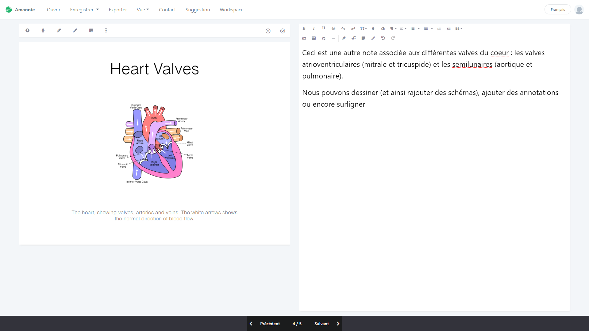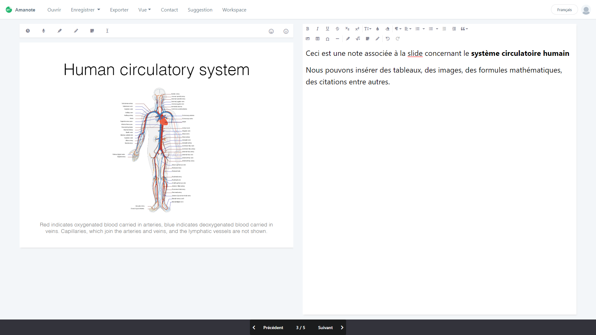 Amanote vous permet d’associer, à chaque slide, un champ de notes spécifique comme vu dans la partie 1. Vous pourrez rentrer des formules mathématiques, dessiner directement dessus (utile si vous possédez un écran tactile) ou encore insérer des images qui puissent correspondre à des photos présentées en cours, mais non-intégrées dans la version PDF partagée par votre enseignant.